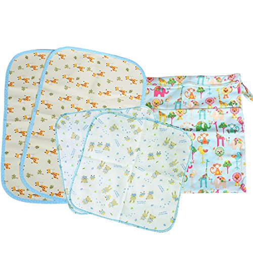 Great value! This baby essentials gift set includes a waterproof wet bag with two zippered pockets, 2 waterproof lap pads and 2 muslin wipe cloth