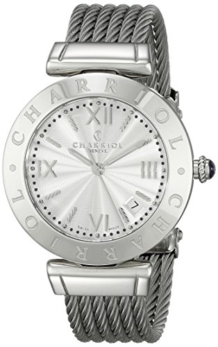 -. Feature : Polished stainless steel case and bracelet (chevron cable), Stainless steel caseback (screw-in), Bezel engraved with "Charriol" / Silver dial - sunray guilloche, Luminescent hands, Silvertone Roman numerals and indices, Date display window between the 4 and 5 o'clock position / Sapphire crystal, Swiss quartz movement, Push/pull crown and a Push-button deployment clasp / Case measurements: 34 mm in diameter x 8 mm thick, Bracelet measurements: 18 mm wide x 7 inches long / Water resistant to 99 feet (3 ATM/30 meters)