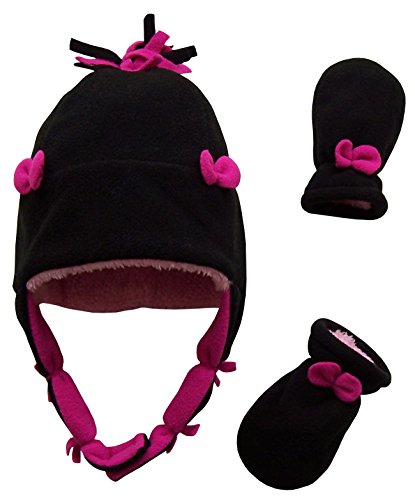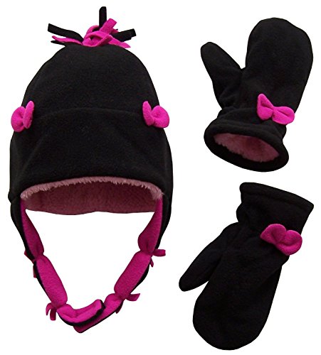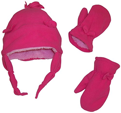 Binding : Apparel Product Description N'Ice Caps TM girls Sherpa lined set with bows. Chin strap on hat has tied down puckered effect for added fashion. Great design for style, comfort, warmth. Colors: fuchsia solid, fuchsia base fairisle print, black/neon pink bows. Sizes: one size fits 2-3yrs (toddler), one size fits 4-6yrs (child). Designed in the USA. Tested and approved as per CPSIA standards. 0