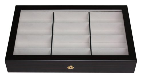 - Feature : Beautiful ebony case keeps glasses protected and scratch-free; Tastefully protects, stores, and organizes up to 12 pairs of oversized glasses / Twelve compartments hold glasses in place; Handsome accessory for your nightstand, desk, or dresser / Attractive faux suede lining protects glasses and adds a luxury feel; Elegant lock and key offer increased security / Store and display your favorite eyeglasses and sunglasses in one convenient and attractive place, or use the case to store ties, coins, or a variety of collectibles / Case measures approximately 13.75" L x 22" W x 3.25" H