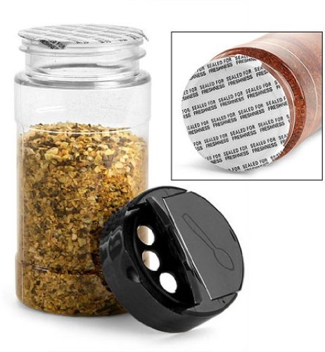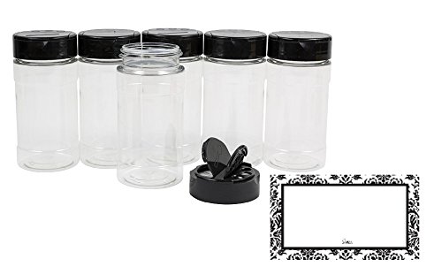 CLEAR PLASTIC SPICE BAIRE BOTTLES, 8 oz Refillable, 6-Pack, Black Flapper Lid, Sifter Shaker Holes and Pour Open Sides, "Sealed for Freshness" Liners, PET, BPA Free, BONUS 6 DAMASK WATERPROOF LABELS
