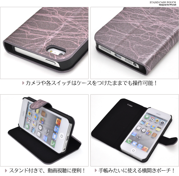 | 落ち着いた波柄のiPhone5専用スタンドケースポーチ。 衝撃やキズなどからiPhone5を守ります。 また、内部にはプラスチックケースを備え、本体をしっかりと固定します。 背面を折り返すとスタンドとして使用できるので、動画視聴に便利です。 カメラはもちろん、基本操作などをケースに入れたまま操作可能です! 横開きタイプなので、手帳のように使うことができます。 ※iPhone5は付属しません。 ※ライセンス商品ではありません。 | ||||||||