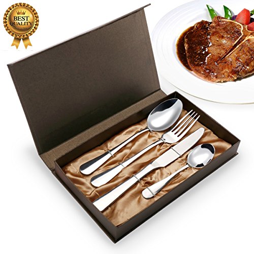 Luxury Gift Package -- 4 pieces in 1 set contains dinner fork, dinner spoon, teaspoon and knife, extremely suitable for home joy and enjoy the gourmet food, such as BBQ, traveling, camping, picnics,etc.