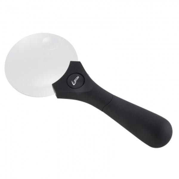 | 光学レンズにより、約3倍、約4.5倍(サブレンズ使用時)に拡大されます。大型レンズなのに軽量(約85g)、また持ち手はラバーで持ちやすいです。LEDライト3灯搭載で、暗い場所でも明るく照らせます。レンズを保護するカバー付きです。 |