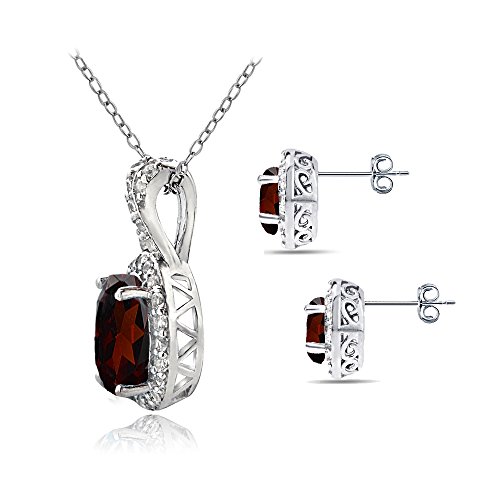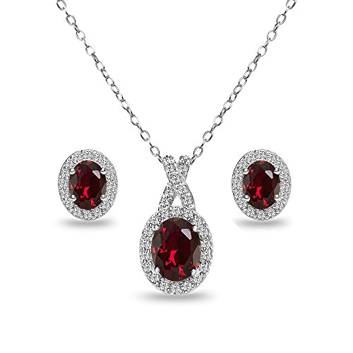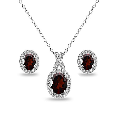 FEATURE - This charming jewelry set displays an X & oval halo garnet necklace pendant with and stud earrings. The garnet pendant features a sparkling 9x7mm oval gemstone surrounded by a halo of white topaz stones below a studded X design. The garnet studs feature 7x5mm oval gemstones surrounded by white topaz stones. This pendant & earring set should be an addition to your fine garnet & gemstone jewelry collection. It can be purchased as jewelry sets for women or jewelry sets for teen girls.