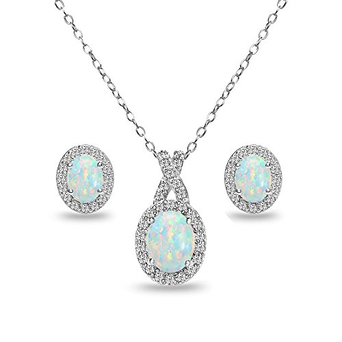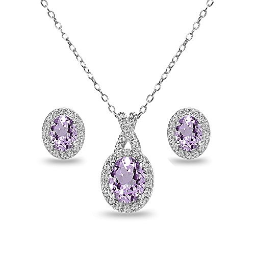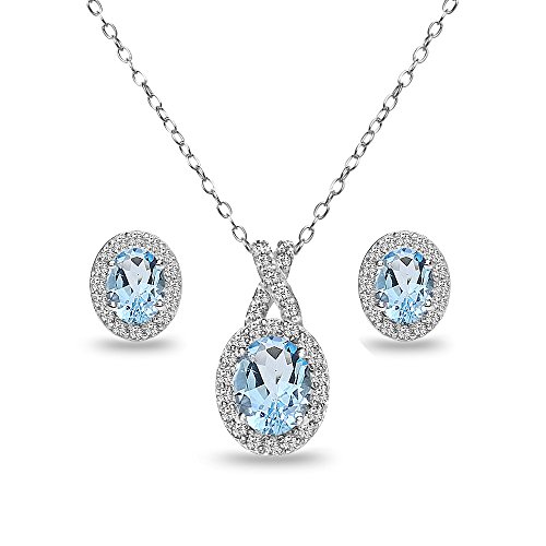 This stunning jewelry set includes stud earrings featuring 7x5mm oval gemstones set in a polished halo setting with surrounding white topaz stones and a pendant necklace featuring an oval 9x7mm gemstone with the "X" design bale showcasing white topaz gemstones for an added touch. The set is entirely crafted of fine sterling silver, nickel & tarnish free. The earrings are secured by post with friction backs and the necklace secures with a spring-ring clasp. The necklace includes an 18 inch rolo chain. Necklace Dimensions: 18 inches in length, 10mm wide, and 18.5mm height. Earrings Dimensions: 10.5mm in length and 8.5mm wide.