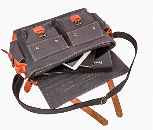 -. Feature : PREMIUM MATERIAL CONSTRUCTION - Superior cowhide crazy horse leather masterfully sewed with durable and red wash canvas fabric to ensure long lasting durability. / PRODUCT UPGRADE - Compared with other briefcases, this updated briefcase's inner foam paddings and bottom foam paddings protect notebook computers by absorbing impacts that can be inflicted in daily life. Carrying handle made of the same cowhide and fixed by high quality hardware, which brings comfortable feeling and makes the bag durable / PRODUCT DETAILS - Inside mobile pocket size is 16" by 12" upto 15.6" laptop fit easily made from leather and canvas and multipocket functionality / USABILITY - Leather messenger bag , satchel bag , laptop bag , school bag , collage bag , briefcase , messenger , office bag , laptop messenger bag / WEARABILITY - The messenger bag features a wide shoulder strap that eliminates shoulder fatigue. The shoulder strap can be easily removed when not required, and effortlessly adjusted to preferred lengths. The bag can be carried by the handle, worn on shoulders, and positioned across body.