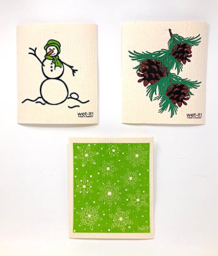 - SWEDISH CLEANING CLOTH: Set of 3 Swedish cleaning wash dish cloths Wet-It featuring Snowman, Winter Day Green, and Pinecones.