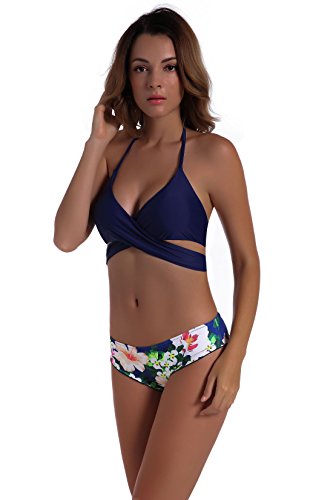 -. Feature : Size Reference:S=US 2-4, M=US 4-6, L=US 6-8 / Front criss cross under bust and tie at back design,adjust cups by sliding along the strap / Navy blue top matches floral P.R.Inting bottom perfectly / Removable padded bikini top / Hipster bot show a good amount of derriere