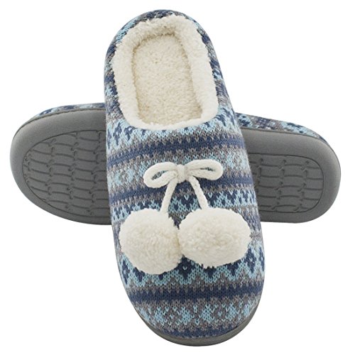 -. Binding : Apparel -. Brand : RockDove -. Department : womens -. Feature : SWEATER KNIT UPPER - knitted festive pattern topped with pom poms add flair and fun to this house slipper / EASY SLIP ON STYLE - secured by a low heel collar to keep your foot from slipping out; if planning to wear socks, please order a size up / MEMORY FOAM FOOTBED - cushions your tired feet after a long day of standing or walking / PLUSH WOOL INNER - keeps your foot warm and cozy on cold evenings during autumn and winter / INDOOR OUTDOOR SOLE - for occasionally stepping outside the house for chores and quick errands -. ProductGroup : Shoes -. ProductTypeName : SHOES -. Title : Pom Pom Sweater Knit Memory Foam Slippers for Women & Teens by RockDove
