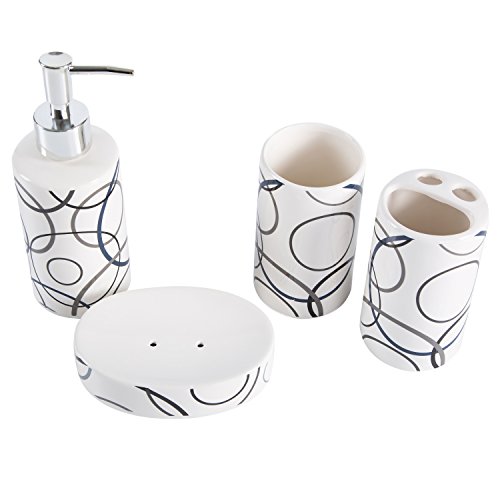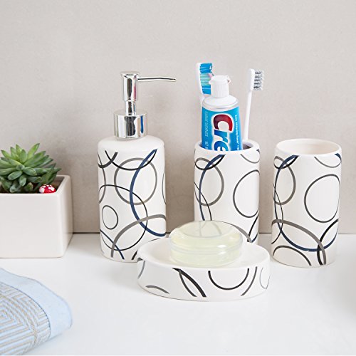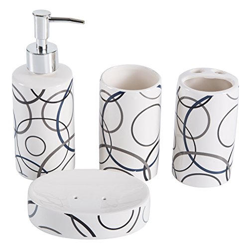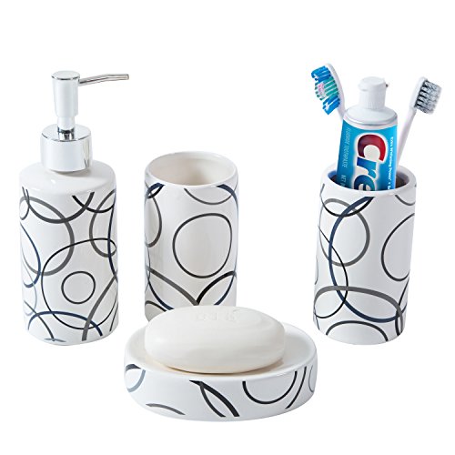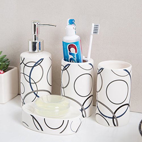 Set includes 1 pump-top soap dispenser, 1 toothbrush holder, 1 soap dish, and 1 tumbler.