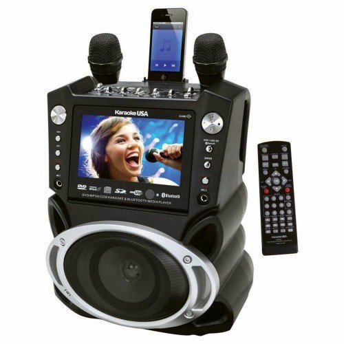 Same popular machine as our GF829, but with Bluetooth. Connect your Bluetooth capable device to the player wirelessly and listen to your device's audio on the karaoke player speaker. This karaoke player has a sleek design matched by no other player you'll ever find. It's features will keep any karaoke enthusiast busy. A color screen that's gorgeous and easy to read far away. Comes with 300 MP3G songs on disc, but will play any normal karaoke CDG, DVD Karaoke or watch a DVD movie. Keeping in tune with the digital age, it will accept auxilary input from most any personal player and gaming console. Even has a handy cradle to rest your MP3 player in for charging or watching your screen in an upright position. Sing and record music and your voice onto an SD Card in MP3 format from your favorite karaoke disc or download, then play it back or take it with you. Audio/video outputs for connection to big screen TV, or better, your home entertainment center for great sound. Operates on 120VAC or 12V car adaptorFeature