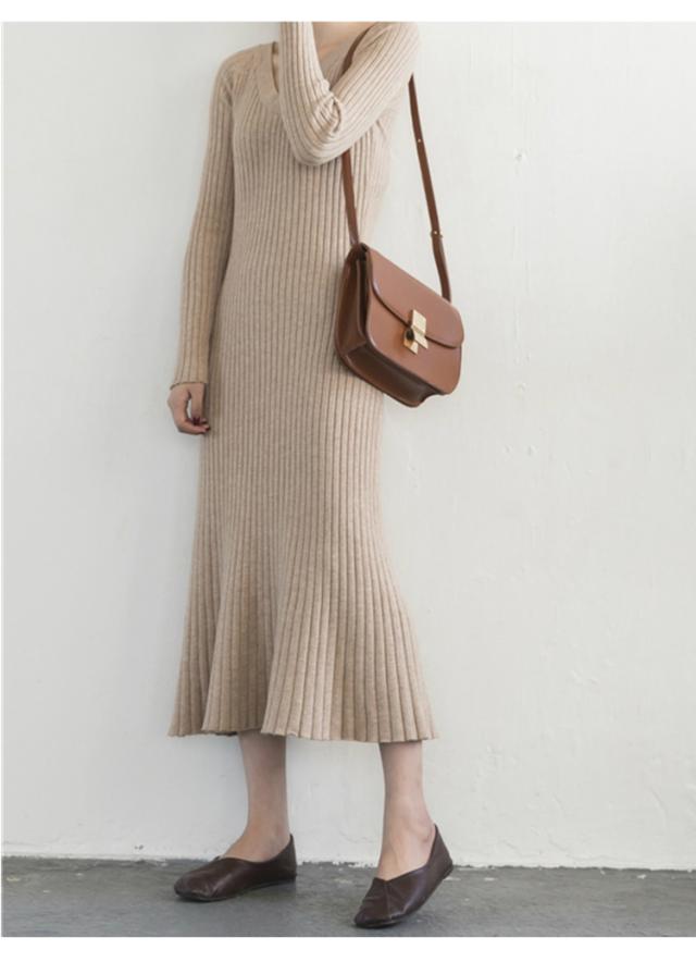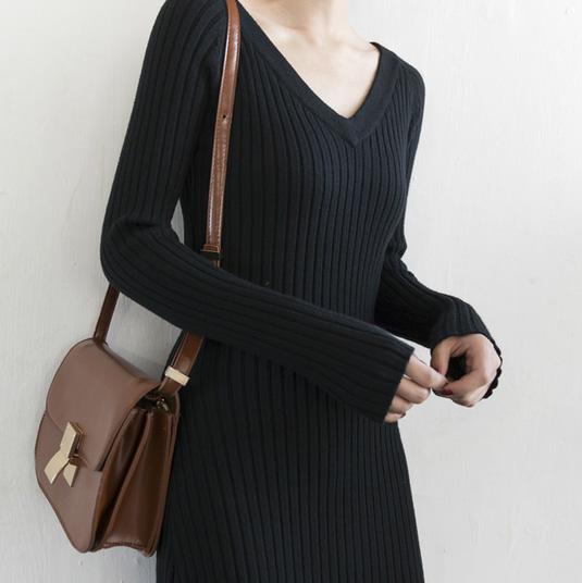 エレガントに着こなせるニットロングワンピース!Vネックと体のラインにフィットするスリムなデザインが女性らしさをプラス!一枚でおしゃれに着こなせるワンピ♪
