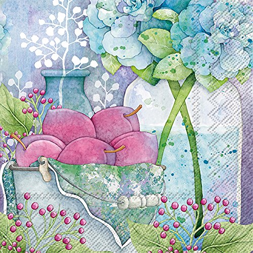 - Beautiful watercolor still-life painting on Periwinkle napkin; features a tin bucket filed with plums, blue blossoms and vase