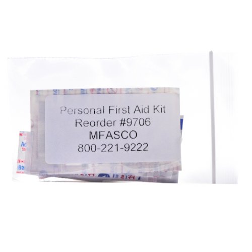 -. Binding : Health and Beauty -. Brand : MFASCO -. Feature : Refill Supplies for Small Personal First Aid Kits and Packs / 24 Pieces of First Aid Supplies Including Pain Medications / Packed in Ziploc Bag / Great for Travel, Small & Compact -. Label : MFASCO -. Manufacturer : MFASCO -. MPN : 9706 -. PackageQuantity : 1 -. PartNumber : 9706 -. ProductGroup : Health and Beauty -. ProductTypeName : HEALTH_PERSONAL_CARE -. Publisher : MFASCO -. Studio : MFASCO -. Title : Personal First Aid Kit Refill Pack