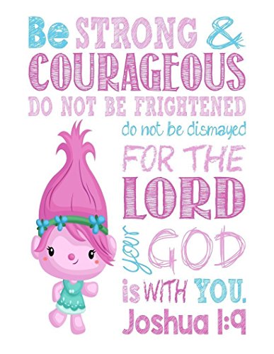 -. Title : Pink Trolls Poppy Inspirational Christian art P.R.Int - Be Strong & Courageous Joshua 1:9 Bible Verse - Playroom or Kids Room - Multiple Sizes