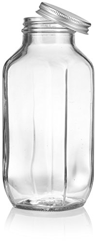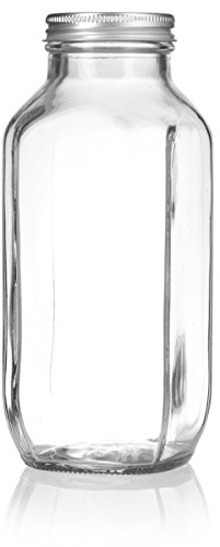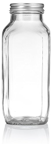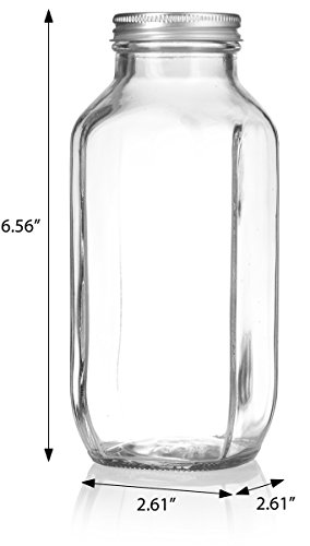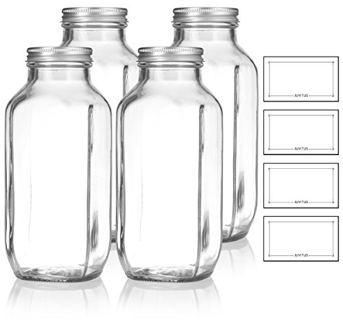 16 oz / 480 ml Clear Thick Plated Glass French Square Empty Bottle Jar with Metal Silver Lid (4 Pack) Perfect for Home, Travel, Juicing, Kombucha