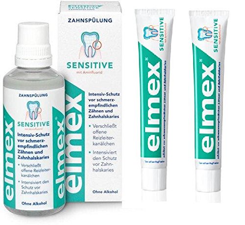 -. Binding : Health and Beauty -. Brand : Elmex -. EAN : 6202566158315 -. Feature : Elmex Sensitive mouthwash with Amine Fluoride, 400 ml / 13.3 fl.oz - especially developed for dental hygiene in areas difficult to access in case of sensitive teeth / Elmex Sensitive Toothpaste, 75ml / 2.5 fl.oz - is ideal for special care and protection of sensitive teeth and exposed tooth necks -. Label : Elmex -. Manufacturer : Elmex -. PackageQuantity : 3 -. ProductGroup : Health and Beauty -. ProductTypeName : HEALTH_PERSONAL_CARE -. Publisher : Elmex -. Studio : Elmex -. Title : Elmex Sensitive mouthwash with Amine Fluoride, 400 ml & Elmex Sensitive Toothpaste (Total 3 items)