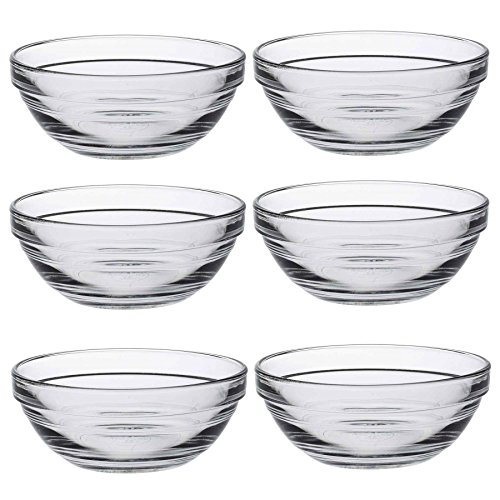 Supply your kitchen with elegant, quality glassware with this set of Lys bowls from Duralex. This set of six glass bowls is perfect for using at meals and for storage. Named after the Lys River which traverses through France and Belgium, these bowls are symbolic of clarity, simplicity, utility, and of course, beauty. They are super durable; impact and chip resistant and built to last, and their quality crafting makes them ideal for any kind of food, hot or cold. All bowls are microwave and dishwasher safe and stackable for convenient storage.5-1/2" diameter x 2-1/4" H, with a 16.9 ounce capacity