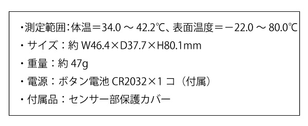●測定範囲:体温=34.0~42.2℃、表面温度=-22.0~80.0℃