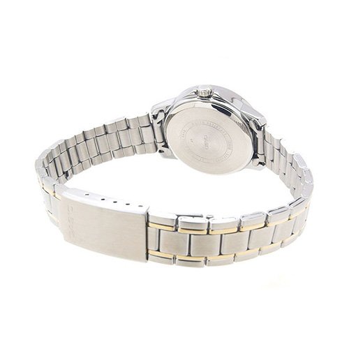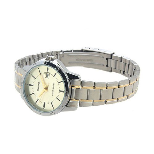 Brand, Seller, or Collection Name:Casio Model number:LTP-V004SG-9A Part Number:LTP+V004SG.9A_-LTP+V004SG.9A Item Shape:ROUND Dial window material type:Mineral Display Type:Analog Clasp:Buckle Case material:Ion Plating Case diameter:35 centimeters Case Thickness:7.80 Band Material:Stainless Steel Band length:Standard Band width:16 millimeters Band Color:two tone Dial color:Yellow Calendar:Yes Special features:water resist Item weight:1.92 Ounces Movement:Quartz Water resistant depth:100 Meters