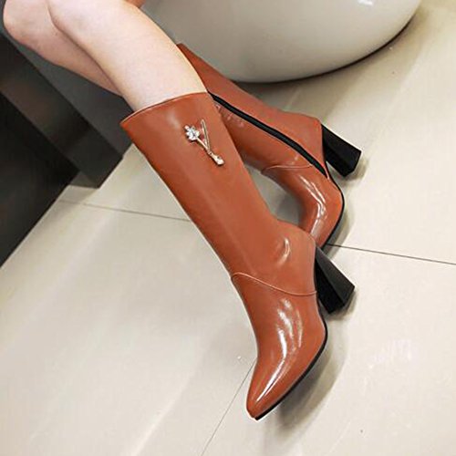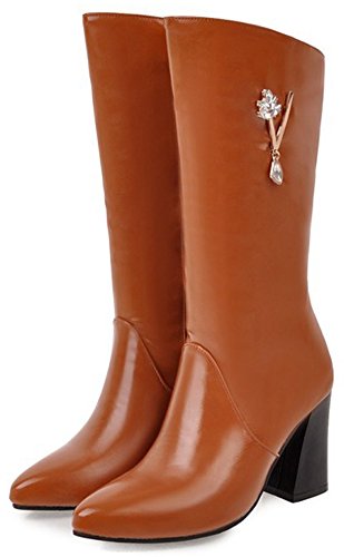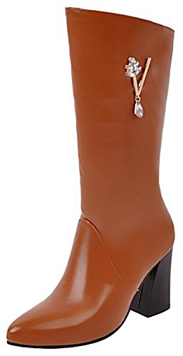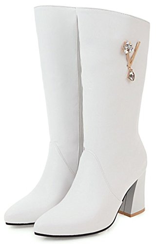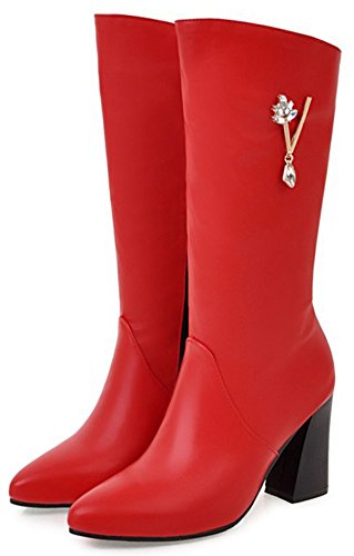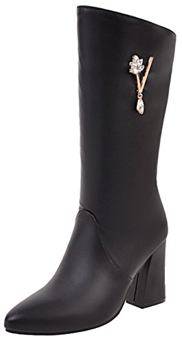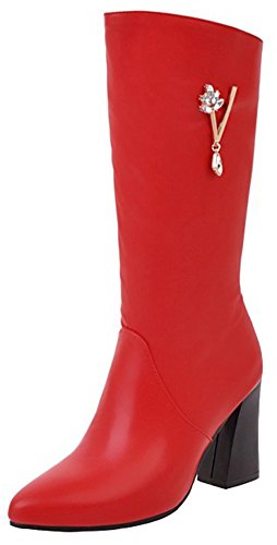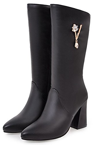 (Mofri)/Women's/Boots/DIRECT FROM USA/Mofri Women's Dressy Rhinestone Pointed Toe Chunky High Heel Mid Calf Boots with Side Zipper