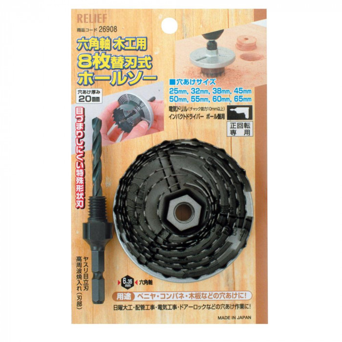 fk094igrjsワンタッチ式で目づまりしにくい特殊形状刃 サイズ 個装サイズ:16×10×5cm 重量 個装重量:214g 素材・材質 ドリル刃/HSS マンドレル/S45C 仕様 8枚刃 替刃式 正回転専用 穴あけ厚み:20mm 六角軸:6.35mm 【使用可能機種】 電気ドリル(チャック能力10mm以上) インパクトドライバー ボール盤 生産国 日本 ベニヤ、コンパネ、木板などの穴あけに ワンタッチ式で目づまりしにくい特殊形状刃