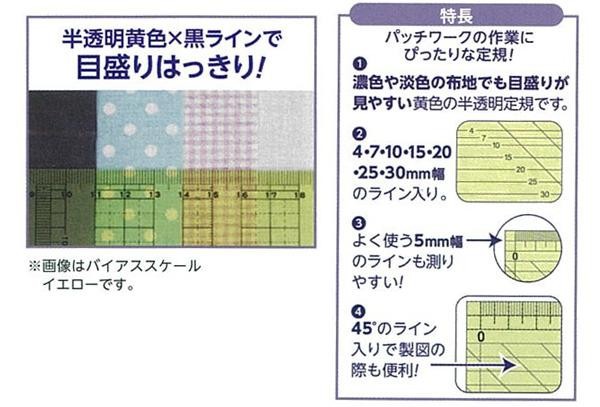 fk094igrjs濃色や淡色の生地でも見やすい淡い黄色の定規です片側にはカッターでの作業に便利なステンレスエッジ付 サイズ 30cm 個装サイズ:6×38×1cm 重量 個装重量:54g 素材・材質 メタクリル樹脂、ステンレス 製造国 日本 エッジ付きでロータリーカッターにも ※モニターの設定などにより、実際の商品と色味等の見え方が異なる場合がございますあらかじめご了承ください 濃色や淡色の生地でも見やすい淡い黄色の定規です片側にはカッターでの作業に便利なステンレスエッジ付