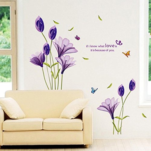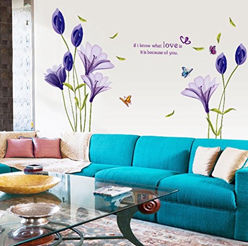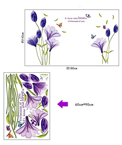 BIBITIME Flying Butterfly Purple Lily Wall Art Flower Decal "If I know what love is it is because of you" Quotes Sticker for Living Room Bedroom