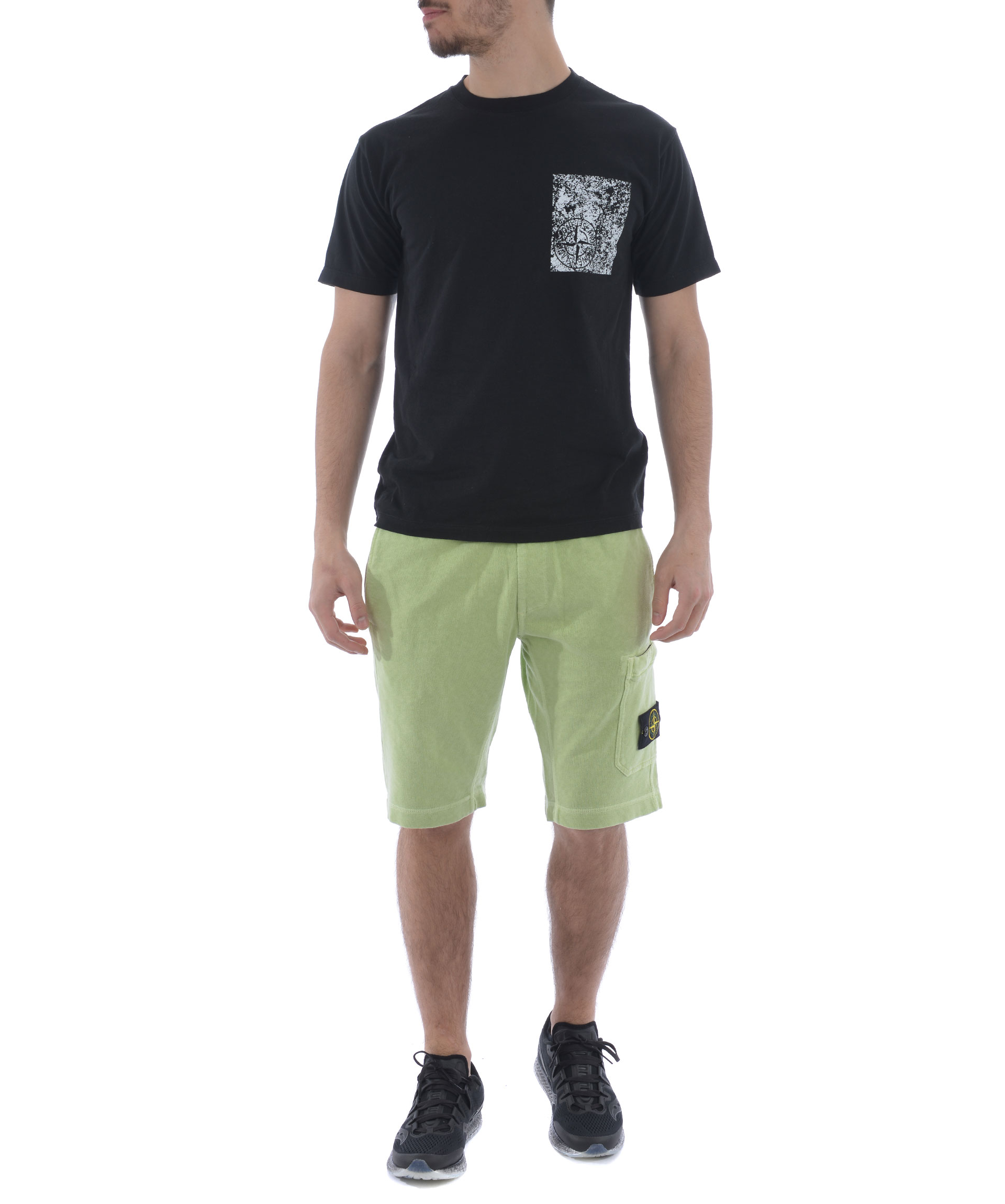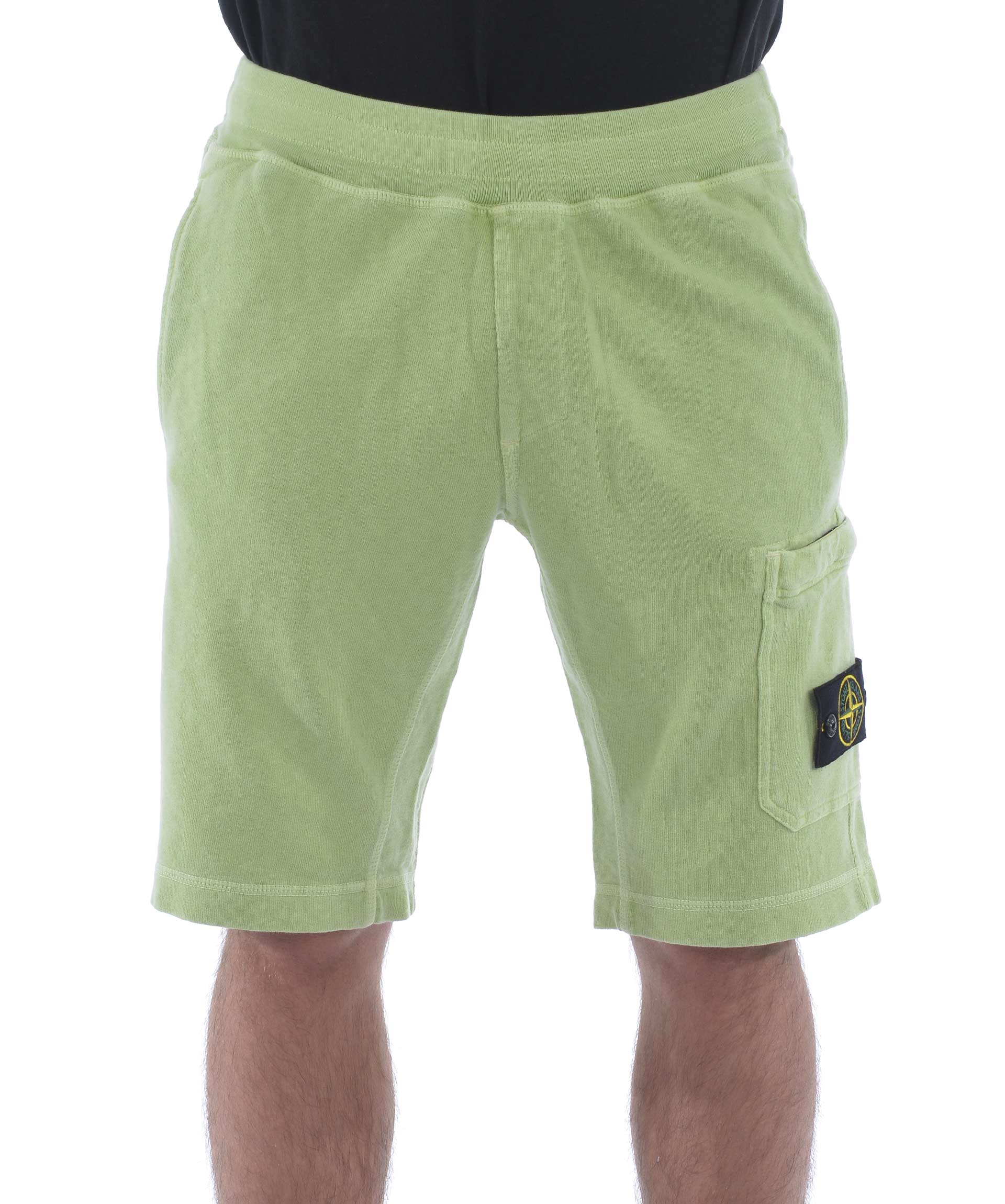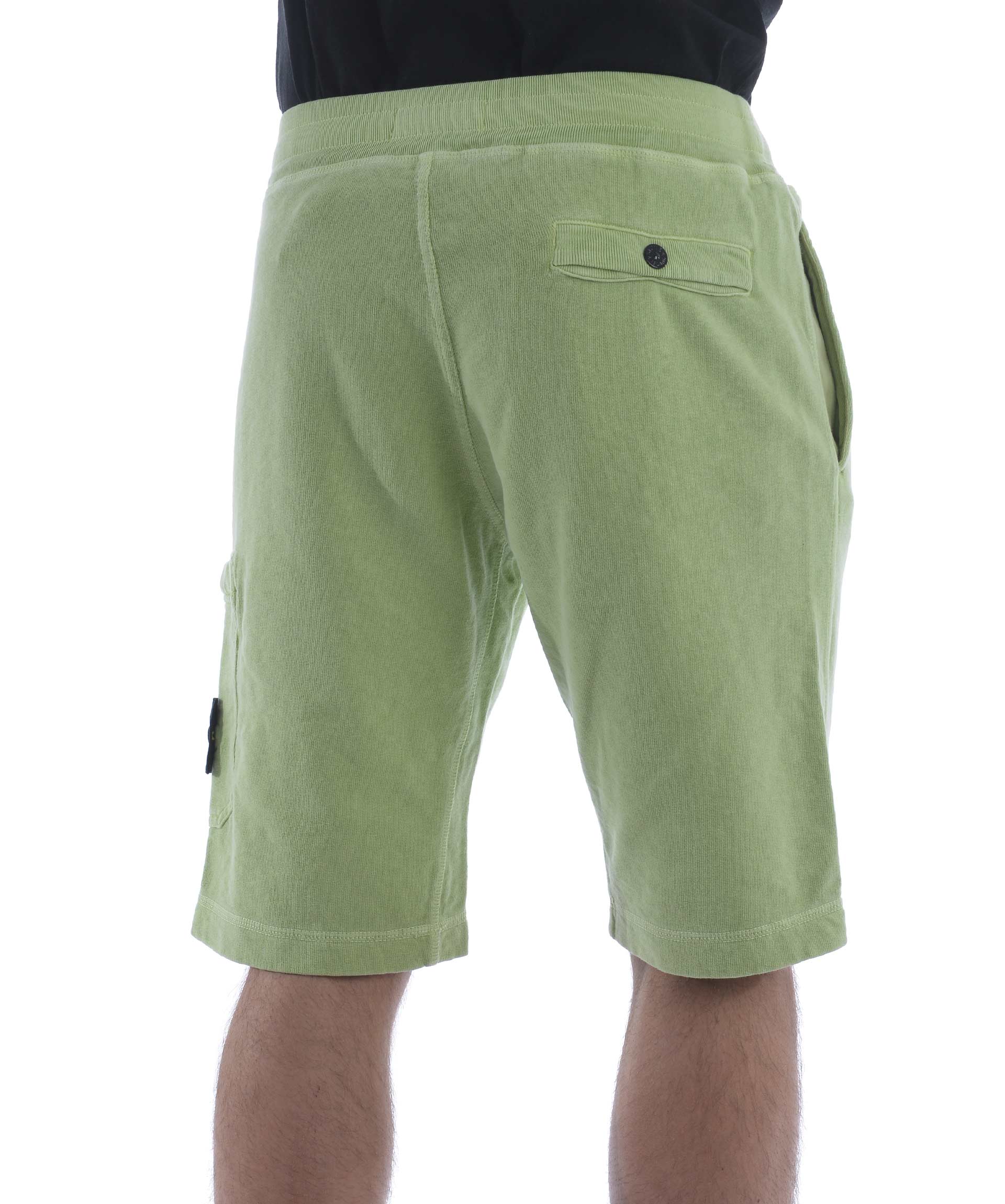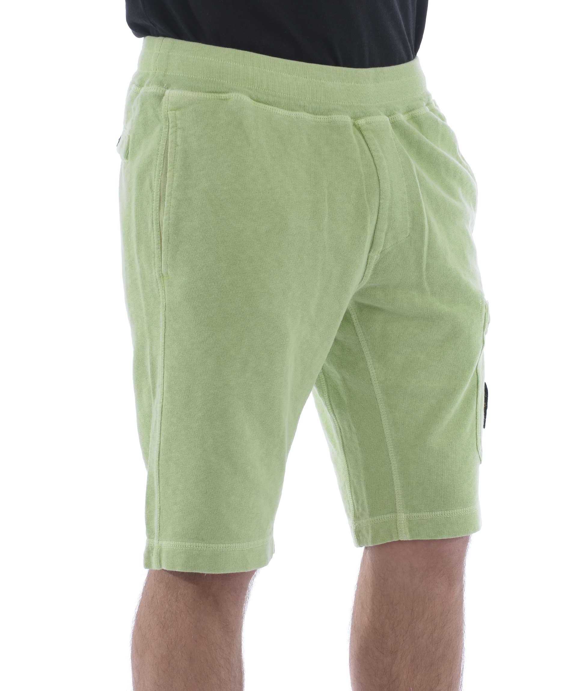 Shorts Stone Island in cotone malfilè Pistacchio. Trattamento effetto old. Elastico in vita con coulisse interna. Tasche frontali a filo. Tascone sulla gamba con zip e patch logo removibile. Tasca posteriore con bottone.