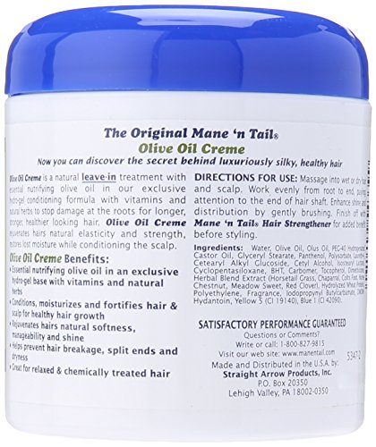 Mane 'n Tail Olive Oil Creme is a natural leave-in treatment with essential nutrifying olive oil in our exclusive hydro-gel conditioning formula with vitamins and natural herbs to stop damage at the roots for longer, stronger, healthier looking hair. Olive Oil Creme rejuvenates hairs natural elasticity and strength, restores lost moisture while conditioning the scalp.Feature