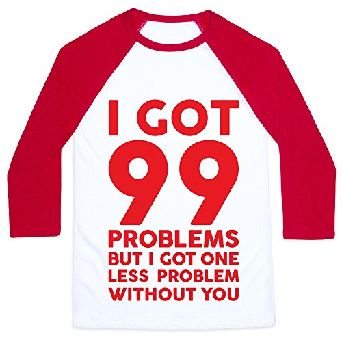 -. Binding : Apparel -. Brand : LookHUMAN -. Color : White/Red -. Department : mens -. Feature : Our unisex baseball tee features 3/4 length sleeves and is made from a lightweight blend of 52% cotton and 48% polyester. Printed in the USA. / ATTENTION: All LookHuman products are original designs, created by humans on our design team. Sellers with similar designs at lower prices are not affiliated with LookHuman, nor are they authorized resellers of our original designs / For amazing products and great customer service, please make sure you choose "LookHuman" as the seller. Our items are printed in the USA. -. MPN : 59341-3200bc -. PackageQuantity : 1 -. PartNumber : 59341-3200bc -. ProductGroup : Apparel -. ProductTypeName : SHIRT -. Title : 99 Problems But One Less Problem Without You Mens/Unisex Baseball Tee by LookHUMAN