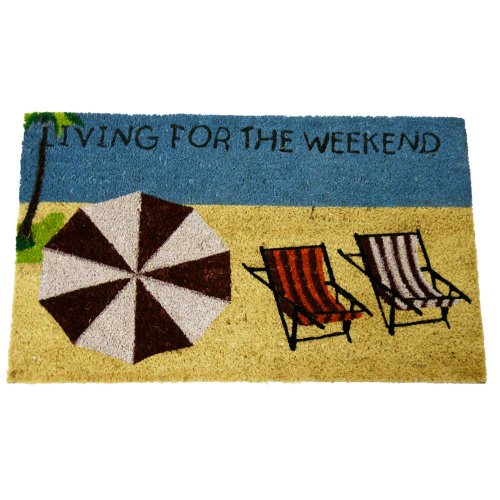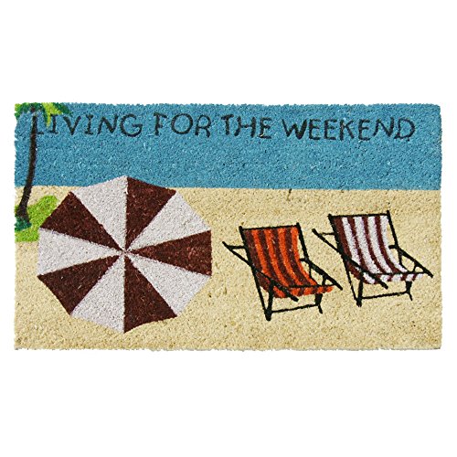 Studio : Rubber-Cal Publisher : Rubber-Cal Binding : Lawn Patio Product Description Rubber-Cal's "living for the weekend" beach doormat is a laid back play on the modern entryway. Featuring an easy-going scene, these fun welcome mats are sure to have your visitors dreaming of vacation. They display a relaxing getaway, natural coir fibers, and a reliable surface that will last atop this decorative floor mat lays a tranquil scene for those who want to escape. Set out on the beach is two comfortable chairs with an umbrella and a palm tree in the background for a giveaway of the location. Allow your guests to break away from the monotony with a unique door mat, even if just while the doorbell is ringing. Made from the fibers of coconut husks, the materials are woven together by hand. If you're looking for a contemporary doormat with a natural texture and look, look no further in addition, the fibers on this welcome coir mat provide a durable surface any time of the year. It is capable of surviving through rain and snow. While you might be worried about the outdoors being tracked inside, this unique doormat offers scraping action to rid shoes of unwanted liquids and grime. Get a mini-vacation without having to step off your front porch with the "living for the weekend" beach doormat display a picturesque setting for all to see while providing guests with a surface for traction and scraping. These fun welcome mats are a flooring option that will fit perfectly at the front of your home, available in 18 x 30 inches with a 5/8-inch thickness. Don't hesitate to indulge in a little rest and relaxation with a decorative floor mat today. 0