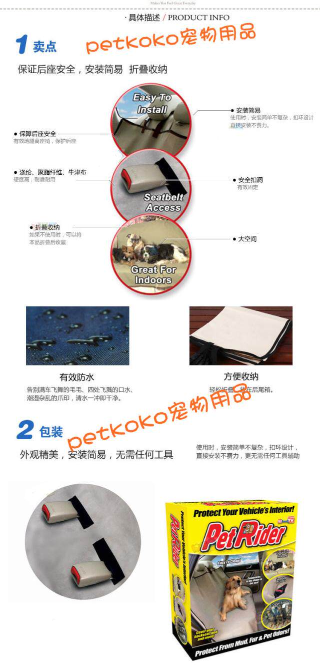 1, the pet car mat on the car's rear seat to start, the positioning webbing were fixed to the rear seat (4 buckle fixed in the front and rear 4 seats) headrest, appropriate adjustments can be;