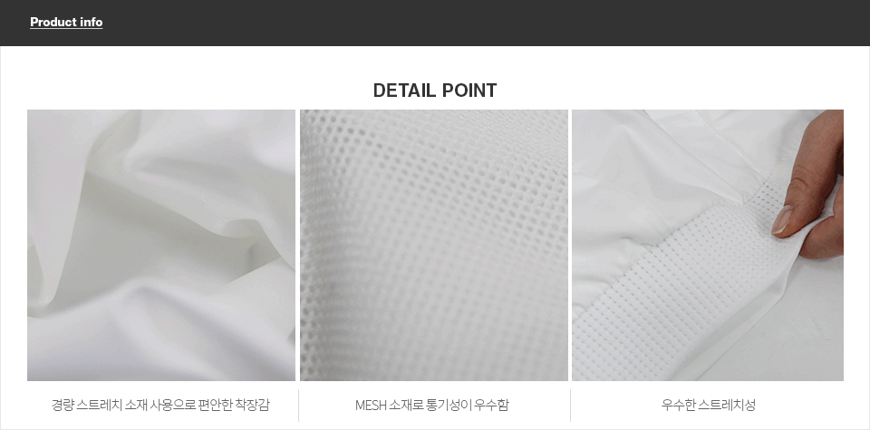 | 소재 | 겉감:폴리에스터100% 배색:폴리에스터95%폴리우렌탄5% 안감:폴리에스터100% |