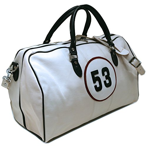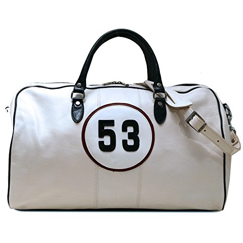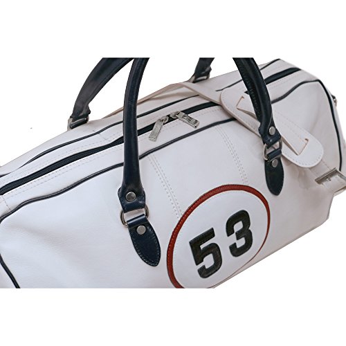 -. Brand : Floto -. Color : White / Dark Navy Blue Trim -. Department : unisex-adult (lage only) -. EAN : 0753640532553 -. Feature : 11" h x 10" w x 21" l / Genuine Leather / Durable Cotton Canvas Lining | Protective Bottom Feet / Stainless Steel Hardware, Detachable Shoulder Strap - 42" / Inside Zipper Pocket -. ProductGroup : Apparel -. ProductTypeName : LAGE -. Size : One Size -. Title : Number 53 White Racing Leather Duffle Bag -. UPC : 753640532553