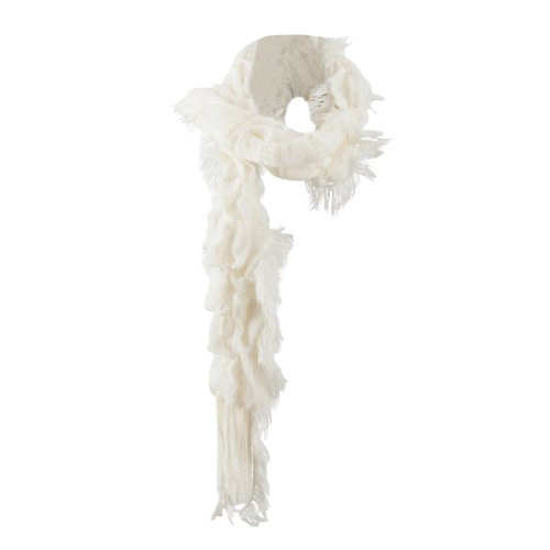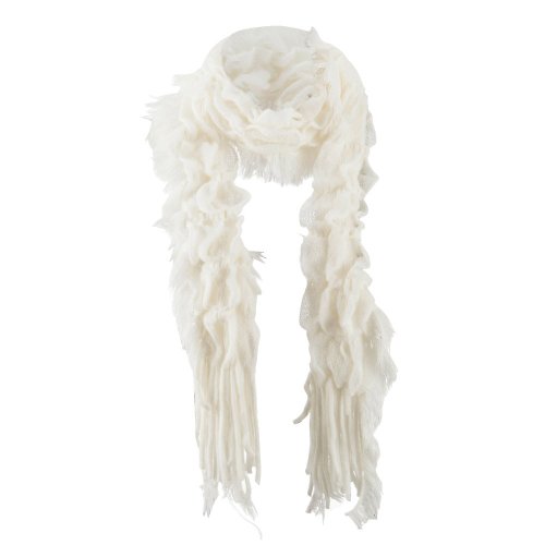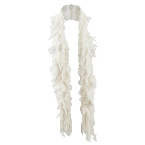Fringed ends, ruffle and feathered fringe detail along the sides of scarf.