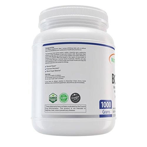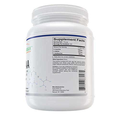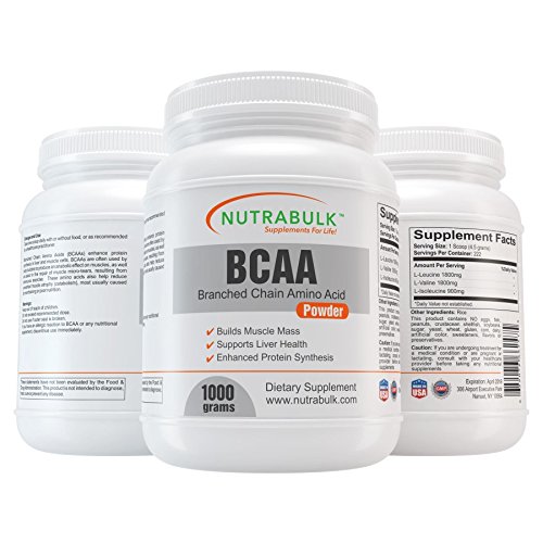 NutraBulk BCAA / Branched Chain Amino Acids Powder. Main Health Benefits: Muscle Building, Muscle Repair, Increased Energy Supplement Facts: Bulk BCAA / Branched Chain Amino Acids (Free Form) - 1 Kilogram Bottle. Primary Use: Building Muscle Mass, Muscle/Tissue Recovery from Exercise, and Liver Health. Branched Chain Amino Acids are the "Building Blocks" of the body. They make up 35% of your muscle mass and must be present for molecular growth and development to take place. Eight are essential (cannot be manufactured by the body) and the rest are non-essential (can be manufactured by the body with proper nutrition). Besides building cells and repairing tissue, they form antibodies, are a part of the enzyme & hormonal system, build RNA and DNA, and carry oxygen throughout the body. The branched chain amino acids L-Valine, L-Leucine, and L-Isoleucine enhance protein synthesis in liver cells and muscle cells. They are thought to contribute to energy production in the body by being oxidized in the cell's mitochondria. Branched chain amino acids are used by bodybuilders to produce an anabolic effect and assist in the repair of micro tears in muscle tissue that are a normal result of exercise. Recommended Dosage: Take 1 scoop (4.5 grams) daily with or without food, or as recommended by a healthcare provider Does not contain sugar, artificial sweeteners, flavors, colors or preservatives. This product is not intended to diagnose, treat, cure or prevent any disease.Feature