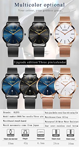 OLEVS Women Ultra Thin 6.5mm Quartz Rose Gold/Black Mesh Steel Wrist Watch with Free Adjust Screwdriver, Waterproof & Date Window