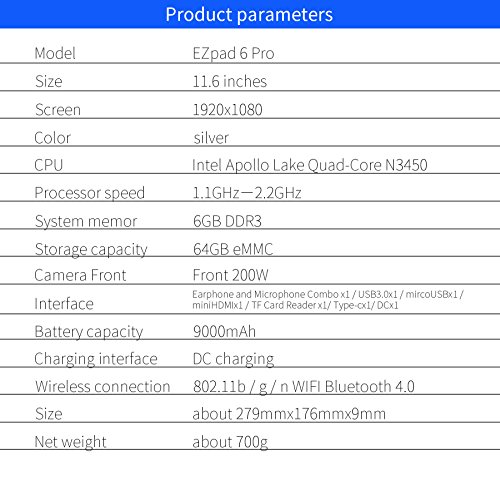 -. Feature : 11.6 Inch IPS touchscreen display ,HD 1920 x 1080 pixels, windows 10 OS Operating System / CPU: Intel Celeron Apollo Lake N3450, Quad-Core 1.1GHz (up to 2.2GHz) processor , with 14nm process technology / GPU: Intel Gen9 HD Graphics 500, frequency up to 700MHZ, makes you playing games smoothly / RAM + ROM: 6GB DDR3 memory 64GB eMMC / 9000mAh battery, Bluetooth 4.0, with HDMI output