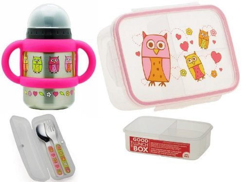 Sugarbooger Divided Good Lunch Box, Silverware, and Flip N Sip Cup Set, Hoot Owl