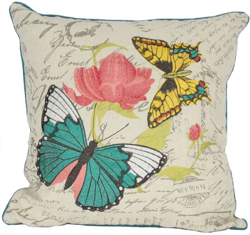 Manor Luxe Papillon Collection Embroidered Butterfly Decorative Pillow Feather/Down Filled, Butterfly on Rose, 18-Inch by 18-Inch