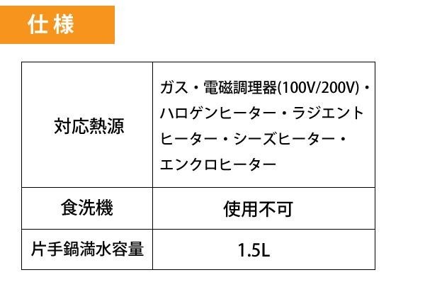 | 仕様 | 対応熱源:ガス・電磁調理器(100V/200V)・ハロゲンヒーター・ラジエントヒーター・シーズヒーター・エンクロヒーター 食洗機:使用不可 片手鍋満水容量:1.5L |
