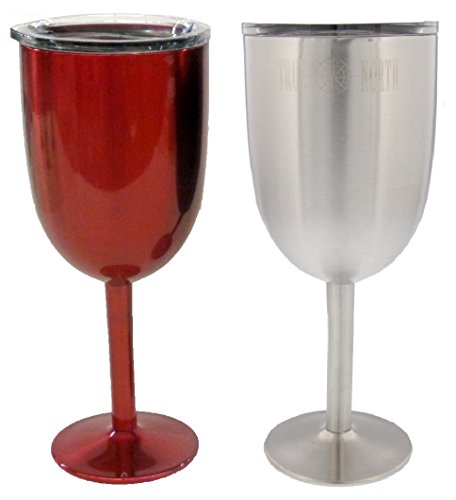 2 True North Stainless Steel Double Walled Wine Glasses With Lids (Red & Stainless Steel)