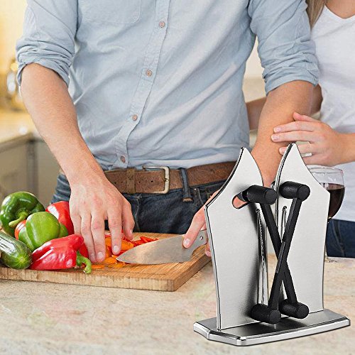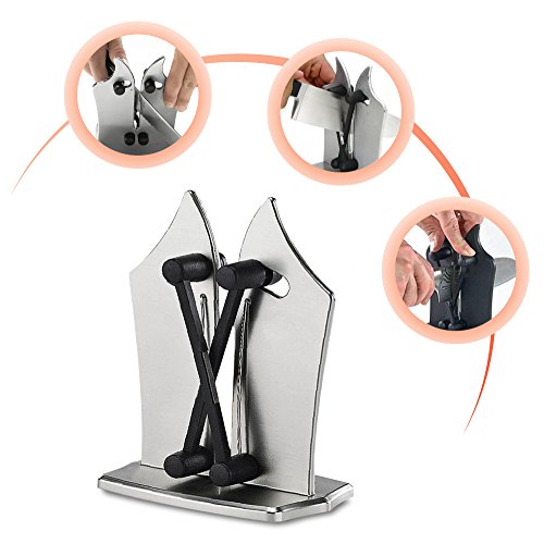 ★ HIGH QUALITY MATERIAL: Knife sharpener made of durable and heavy stainless steel and Resin ,Easy to stand on the table when you using ( not easy removable) .