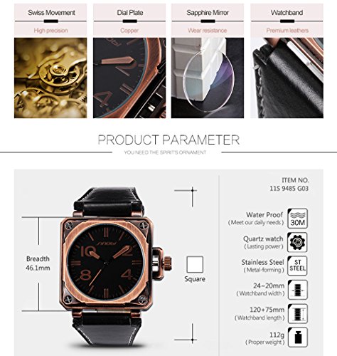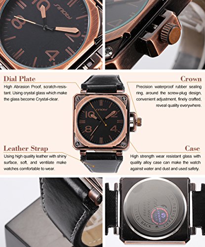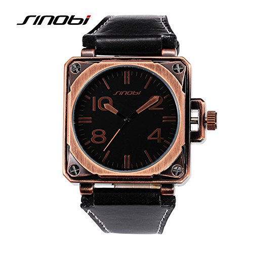 -. Feature : A. Masculinity Wristwatch Design: Coincident round&square dial design with big numbers, and classical business genuine leather watchband, right outspread lug crown design, perfect blend of timeless theme style, massy appearance produces your man glamour and powerful style. / B. Extraordinary Watch Technology: Wrist watches from professional technicians and serious focus, Japanese quartz movement, stainless steel water resistant, provides precise and accurate time keeping. Precision is our inspiration. Time will tell. / C. Waterproof for Daily Use: 50M waterproof, perfect for all kind of business, casual, indoor activities or daily use. Note: Please DO NOT press any buttons in water or no longtime underwater activities - such as diving. / D. The Mastery of Time: Thoughtful watch, only for wise man, time walker. Be the king of the spiritual kingdom that is your heart. Take in the journey, business, party, banquet, sport or as a gift for friends. Masculinity confidence emerges inside to outside. / E. About SINOBI: Established in 1996, with 20 years history, SINOBI has been crating wrist watches a fashions & styles code. The mission is to convey a philosophy, Seize time, Never late to discover, Beyond your imagine. The goal of SINOBI is to make every watch a work of art, as global fashion model.