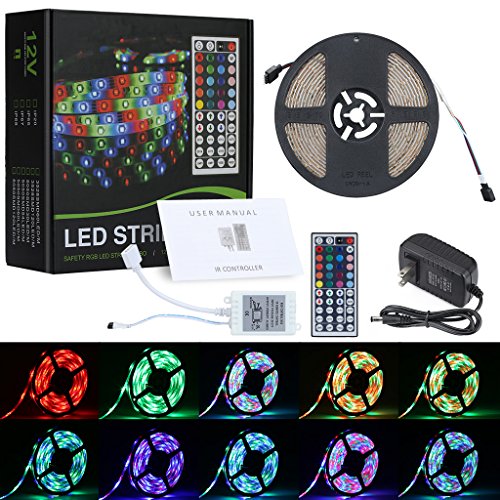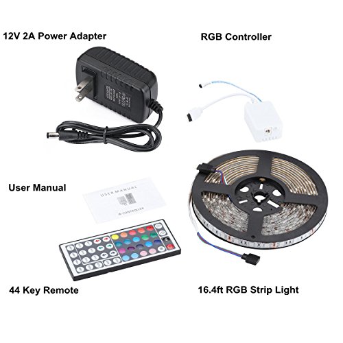 PACKAGE INCLUDES: 1 x 16.4ft RGB LED strip light with 300 SMD LEDs, 1 x RGB LED controller, 1 x 44 key remote, 1 x power supply adapter, 1 x user manual