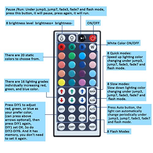 MULTI-COLOR&MODE OPTION: 16 colors with 8 light pattern and 6 DIY keys for memorizing the colors of LED strip lights you like