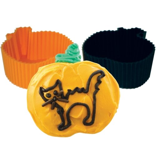 -. Feature : Set of 8 colorful orange and black pumpkin shaped cupcake holders / Made of reusable food grade silicone; heat resistant to 600 degrees F. / Simply place on cookie sheet to bake / Easy to use and durable; dishwasher safe / Measurements: 2.5 x 2.5 x 1.2 inches