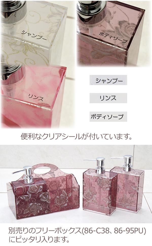 | 透明感のある柄でバスルームが華やかに。シャンプー、リンス、ボディソープと書いた3種類のシールが付属していますので、貼ってご使用いただけます。 |